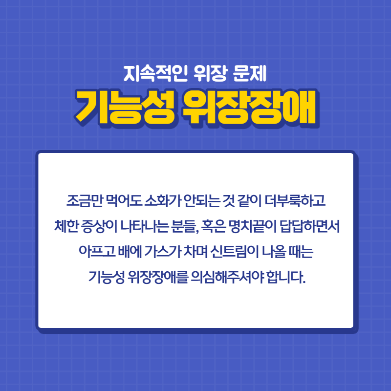 조금만 먹어도 소화가 안되는 것 같이 더부룩하고 체한 증상이 나타나는 분들, 혹은 명치끝이 답답하면서 아프고 배에 가스가 차며 신트림이 나올 때는 기능성 위장장애를 의심해주셔야 합니다.