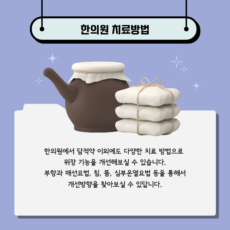 한의원에서 담적약 이외에도 다양한 치료 방법으로 위장 기능을 개선해보실 수 있습니다.