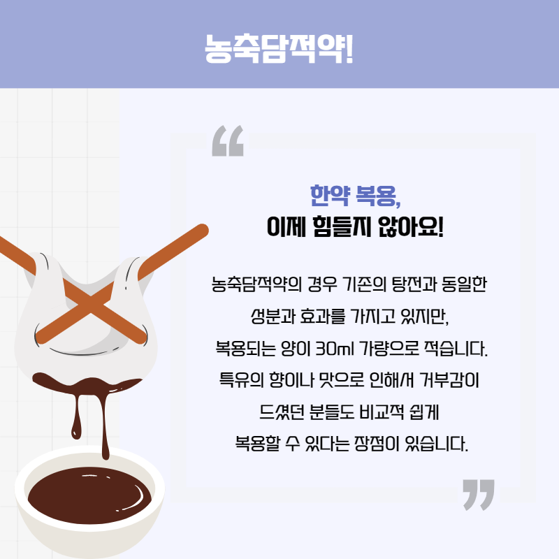 농축담적약의 경우 기존의 탕전과 동일한 성분과 효과를 가지고 있지만, 복용되는 양이 30ml 가량으로 적습니다.