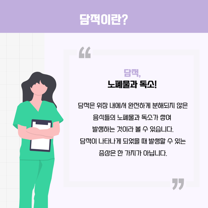 담적은 위장 내에서 완전하게 분해되지 않은 음식들의 노폐물과 독소가 쌓여 발생하는 것이라 볼 수 있습니다.