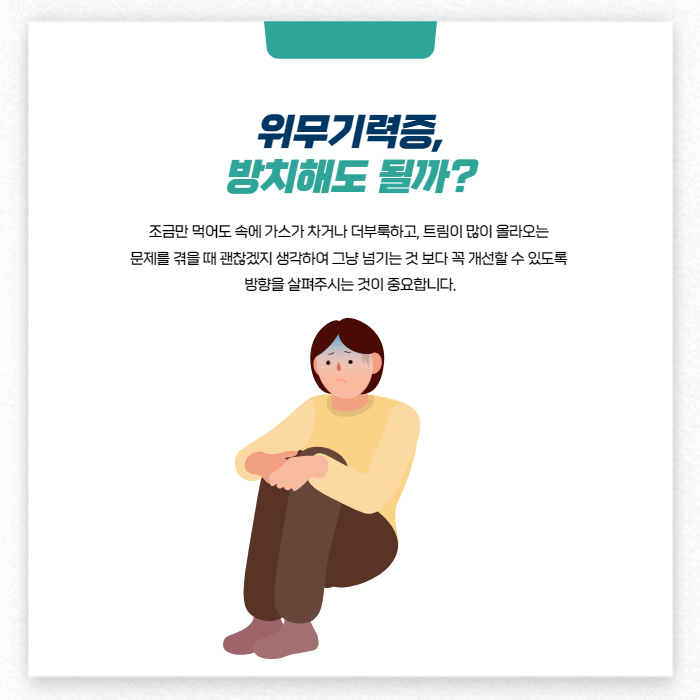 조금만 먹어도 속에 가스가 차거나 더부룩하고, 트림이 많이 올라오는 문제를 겪을 때 괜찮겠지 생각하여 그냥 넘기는 것 보다 꼭 개선할 수 있도록 방향을 살펴주시는 것이 중요합니다.